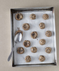 Con un porzionatore da gelato deponete delle palline di impasto sopra 2 teglie rivestite di carta forno. Mettete le teglie in freezer per almeno un'ora. Scaldate il forno a 210°, infornate le teglie per 5 minuti, quindi estraetele e schiacciate i biscotti con il dorso di un cucchiaio.