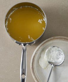 Preparate il ghee. Tagliate a dadini il burro, mettetelo in una casseruola e ponete sul fuoco basso. Quando si sarà sciolto inizierà a formare bolle e una schiuma che eliminerete con un colino a maglia fine. Quando il burro è limpido e prende un colore dorato, versatelo in una ciotola e lasciatelo raffreddare e rapprendere. Potete prepararlo in anticipo e conservarlo anche fuori dal frigorifero.