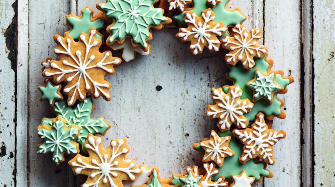 Biscotti a forma di fiocchi di neve e stelle, diversamente glassati, formano una splendida ghirlanda, da appendere in casa o da portare in dono