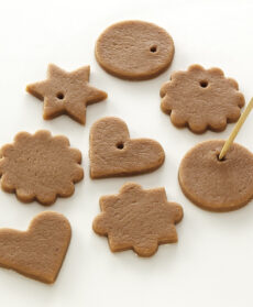 Stendete la pasta in una sfoglia di 1/2 cm di spessore e ricavate dei biscotti di forme diverse. Create un buchino sulla parte superiore con una cannuccia, trasferiteli sulla teglia foderata con carta da forno e cuoceteli in forno a 180° per 20 minuti circa.