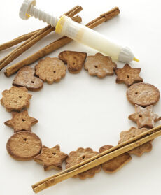 Realizzata con biscotti al cacao e stecche di cannella, è da appendere sotto rami di vischio o bacche rosse per tutte le Feste