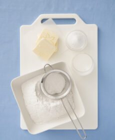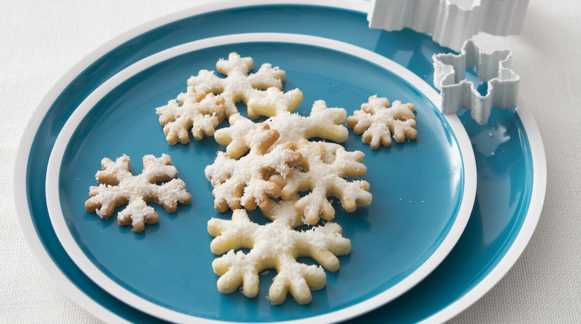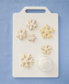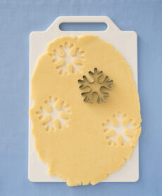 Stendete la pasta con il matterello, sul piano infarinato, a uno spessore di 4 mm. Ritagliate i fiocchi di neve con delle formine e trasferiteli su una placca foderata di carta da forno. Cuocete a 180° per circa 12 minuti. Sfornate, fate intiepidire, poi trasferite i biscotti su una gratella.