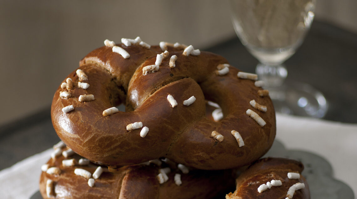 3) Sgonfiate l'impasto, dividetelo in 6 parti di uguale peso e formate tanti cordoncini di circa 30 cm di lunghezza. Intrecciate le 2 estremità nella tipica forma a nodo e fissatele; trasferite i bretzel, distanziati, su una teglia rivestita con carta da forno.