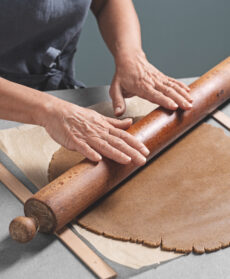 Tagliate il burro a cubetti e trasferitelo in freezer per qualche minuto. Mescolate intanto in una ciotola la farina, lo zucchero di canna, un pizzico di sale, il bicarbonato e 2 cucchiai rasi di mix di spezie; aggiungete il burro molto freddo e lavorate gli ingredienti fino a ottenere un impasto a briciole. Infine amalgamate l'uovo sgusciato e la melassa; formate una palla, avvolgetela nella pellicola e fatela riposare in frigo per 2 ore. Stendete metà dell'impasto con il matterello allo spessore di 3 mm e fatelo raffreddare bene in frigorifero per almeno 30-40 minuti. Fate lo stesso con l'impasto rimasto.