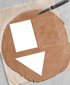 Preparate delle dime per le casette delle forme e misure che preferite. Nella sequenza i 2 triangoli misurano 12 (base )x13 cm per la casetta grande e 10 (base)x11 cm per quella piccola; i 2 rettangoli misurano 10,5x15 cm per la casetta più grande, 7,5x12 cm per quella piccola. Appoggiate le dime sulla pasta e ritagliate i 2 triangoli e i 2 rettangoli per ciascuna casetta. Se l'impasto non è sufficiente, rimpastate gli avanzi, stendeteli con il matterello, fateli raffreddare e ritagliateli.