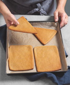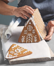 Appoggiatevi su un tagliere ricoperto con carta da forno e assemblate le casette con la glassa rimasta, incollando i due triangoli del fronte e del retro e i due lati del tetto. Tenete premuti delicatamente i pezzi per qualche istante e lasciate asciugare per almeno 5 ore prima di spostare le casette.