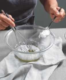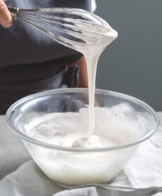 Mescolate l'albume in una ciotola con la frusta unendo gradualmente lo zucchero a velo.