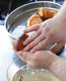 Mentre il composto base del to babà lievita, imburrate bene 8 stampini. Dividete il composto lievitato in porzioni tutte uguali, di circa 30/40 grammi di peso, e inseritelo negli stampini, per continuare la lievitazione. Coprite con il solito canovaccio umido e aspettate finché il babà riempirà la formina fino all’orlo.