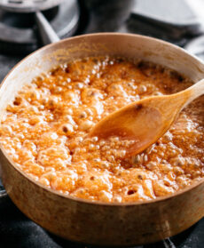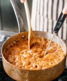 In un'altra casseruola a fondo spesso versate lo zucchero, lo sciroppo di glucosio e 30 ml d'acqua. Portate sul fuoco moderato e cuocete fino a ottenere un caramello biondo e trasparente. Versate sul caramello il burro nocciola, il succo di mela intiepidito e il composto di panna e mascarpone. Aggiungete anche le fettine di mela e mescolate bene. Lasciate sul fuoco, continuando a mescolare, finché il composto raggiunge i 120°