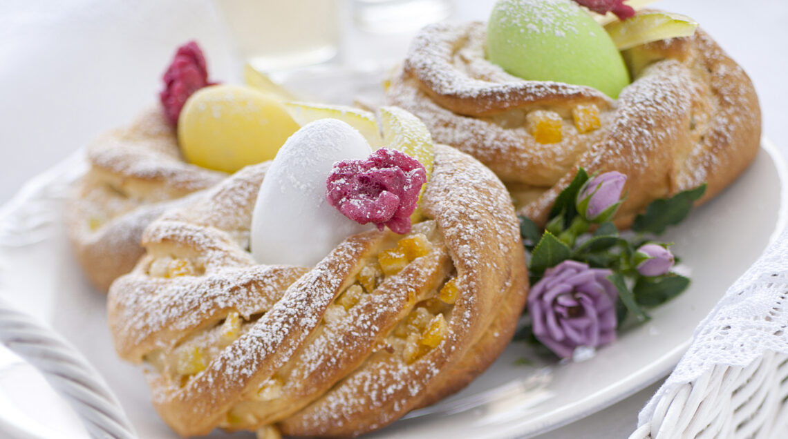 1) Prepara l'impasto. Mescola il lievito di birra in una ciotola con 75 ml di acqua tiepida, unisci 140 g di farina di manitoba e forma un panetto che lascerai riposare per 30 minuti, finchè sarà raddoppiato di volume. Setaccia la farina rimasta con lo zucchero e un pizzico di sale, amalgama il latte tiepido, i tuorli e 120 g di burro morbido a fiocchetti; lavora gli ingredienti, fino a ottenere un impasto omogeneo. Aggiungi all'impasto il secondo panetto e lavorali a lungo, finchè i due composti saranno perfettamente amalgamati. Metti il nuovo impasto in una ciotola, copri e fai lievitare per 2 ore, finchè sarà raddoppiato di volume.