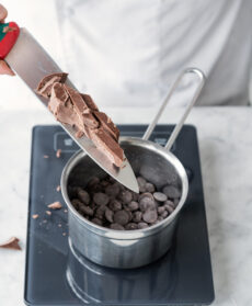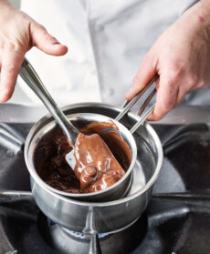 Inserite il padellino in una pentola più grande con poca acqua, trasferite il tutto sul fuoco e fate sciogliere il cioccolato a bagnomaria, mescolando con una spatola.