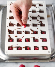 Distribuite metà cioccolato in uno stampo di 35 cioccolatini, arrivando fino a metà altezza. Disponete al centro di ciascun cioccolatino un pezzetto di lampone (meglio spezzarli a mano perché non perdano acqua) e coprite con il composto rimanente, livellando con un coltello. Fate rapprendere in frigorifero per un paio d'ore.
