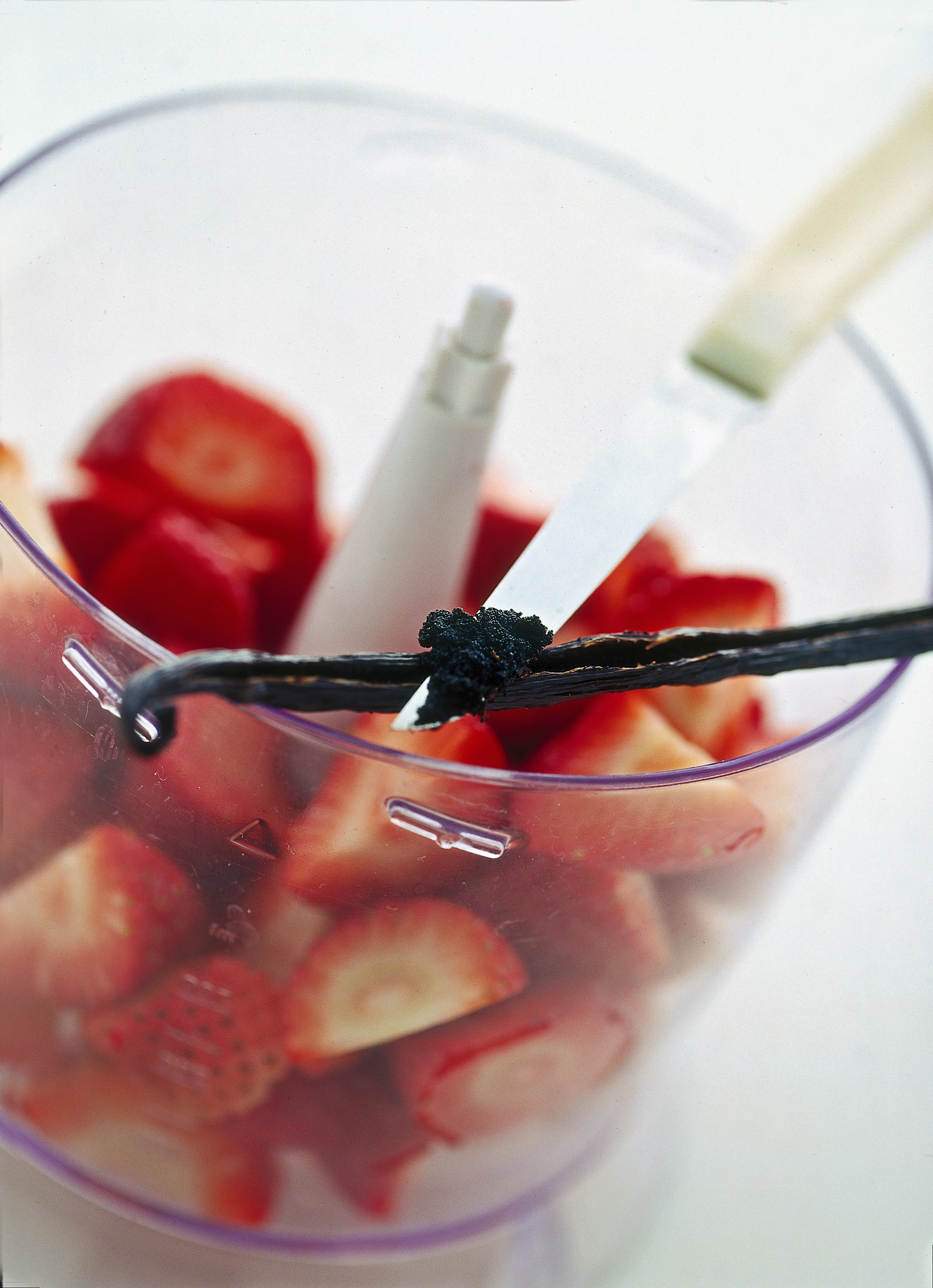 In una terrina lavorate la ricotta con lo zucchero semolato, il Cointreau e le fragole frullate, poi aggiungete i semini prelevati dalla stecca di vaniglia e mescolate.