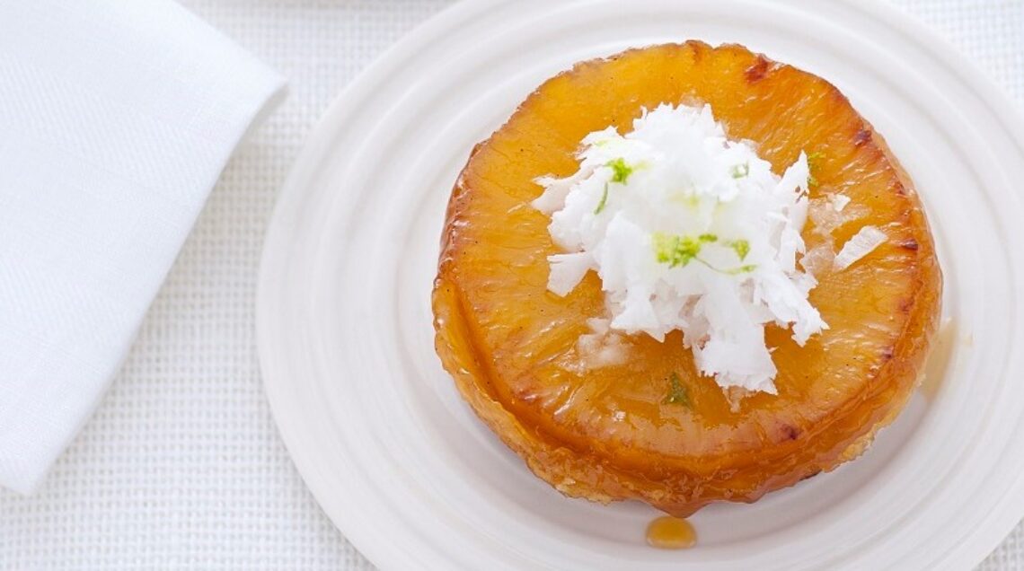 1) Pulite l'ananas e tagliatelo a fette di circa 1 cm di spessore. Poi, rompete la noce di cocco, staccate la polpa aiutandovi con un coltello, eliminate la pellicina marrone che la riveste e grattugiate la parte bianca con una grattugia a fori grossi. Successivamente lavate il lime e grattugiate la scorza.