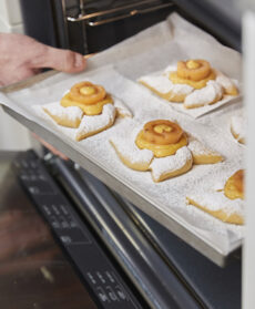 belle, colorate, aromatiche e golosissime, le girandole sono state preparate per noi da Domenico Spadafora, originario della Calabria, figlio dell'arte pasticcera, è infine approdato a Pavia, dove gestisce il suo negozio. Questi dolcetti omaggiano un frutto fugace della primavera, le nespole, qui interpretate con crema pasticcera e confettura e un impasto ben lievitato che diventa soffice e gonfio. Buone fin dalla prima colazione, le girandole conquistano subito per il sapore fresco della frutta e quello intenso della pasta e della doppia farcia.