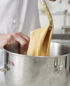Lavorate nella planetaria 330 g di farina, il lievito e 3 uova. Quando l’impasto sarà liscio, aggiungete 83 g di zucchero e il miele in tre riprese, quindi 8 g di sale, 50 g di burro miscelato con il fior d’arancio e, infine, l'uovo rimasto. Impastate ancora a mano per un minuto e fate riposare il panetto per due ore a temperatura ambiente coperto con la pellicola, quindi mettetelo in frigo per una notte.