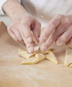 Il giorno seguente stendete la pasta sul piano infarinato a uno spessore di 1 cm e tagliatela in circa 15 quadrati da 10 cm di lato. Incidete i 4 angoli dei quadrati in diagonale senza arrivare fino al centro.