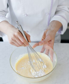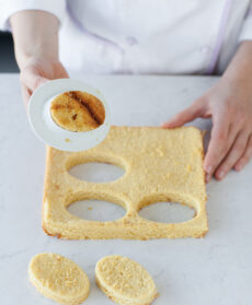 4) Sformate il pan di Spagna, eliminate la crosticina superficiale e tagliatela con un tagliapasta in formine ovali.