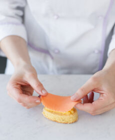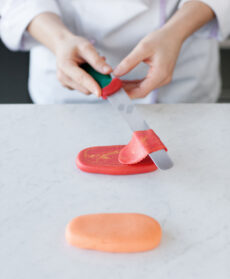 5) Formate dei cilindretti con il marzapane rosso e arancione, appiattiteli in modo che assumano una forma ovale un po' più grande delle formine di pasta e tagliateli a fettine sottilissime con un coltello seghettato.