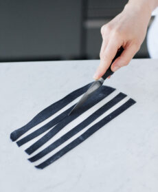 6) Stendete sottile il marzapane nero e tagliatelo a strisce.