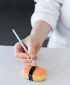 7) Appoggiate le fettine arancioni su metà degli ovali farciti e quelle rosse sugli altri, simulando così il sushi al salmone e al tonno.