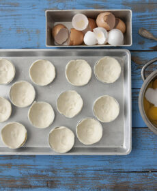 Sovrapponete le due sfoglie di pasta, arrotolate e tagliate a fette spesse (2 cm circa). Disponete una fetta di impasto sul fondo di ciascuno stampino, stendetela con i pollici e foderateli completamente.