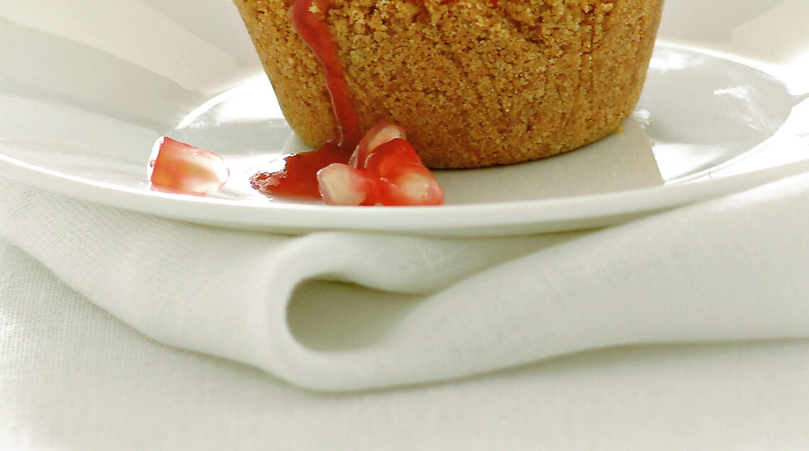 4) Sistema i gusci di biscotto nei piatti, versa su di essi la crema e lo sciroppo. Gusta i piccoli cheesecake con crema variegata decorati con i chicchi di melagrana messi da parte.