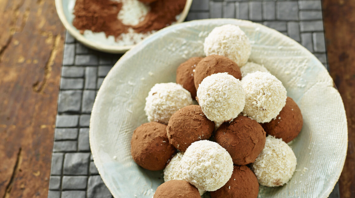 3) Preleva i due impasti a cucchiaiate e ricava, lavorandole nel palmo della mano, tante palline della dimensione di una grossa noce, passandole successivamente una metà nella polvere di cacao e l’altra metà nella farina di cocco rimasta.