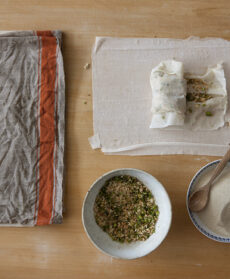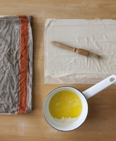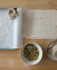 Rivestite una teglia di carta forno. Trita le nocciole e i pistacchi e riuniscili in una ciotola con 60 g di zucchero. Apri la pasta fillo sul piano di lavoro e tienila coperta con un telo bagnato e ben strizzato. Sciogliete il burro in una casseruola. Prendete un foglio di pasta fillo, spennellatelo leggermente di burro, piegatelo a metà.