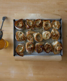 Dolcetti scenografici e croccanti, sono spennellati di sciroppo all'arancia e farciti di pistacchi e nocciole
