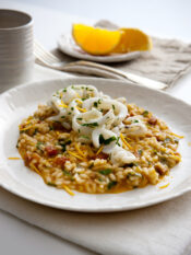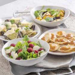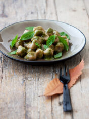 4) Servi le sfogliatine con salsa alle nocciole in un piattino, distribuendo la salsa di nocciole a specchio ed adagiandovi un disco di sfoglia caramellato, farcendolo con qualche fettina di caco - fresca o tiepida, in base ai gusti - e coprendo con un altro disco di sfoglia. A piacere, decora ancora con una spolverizzata di zucchero a velo.