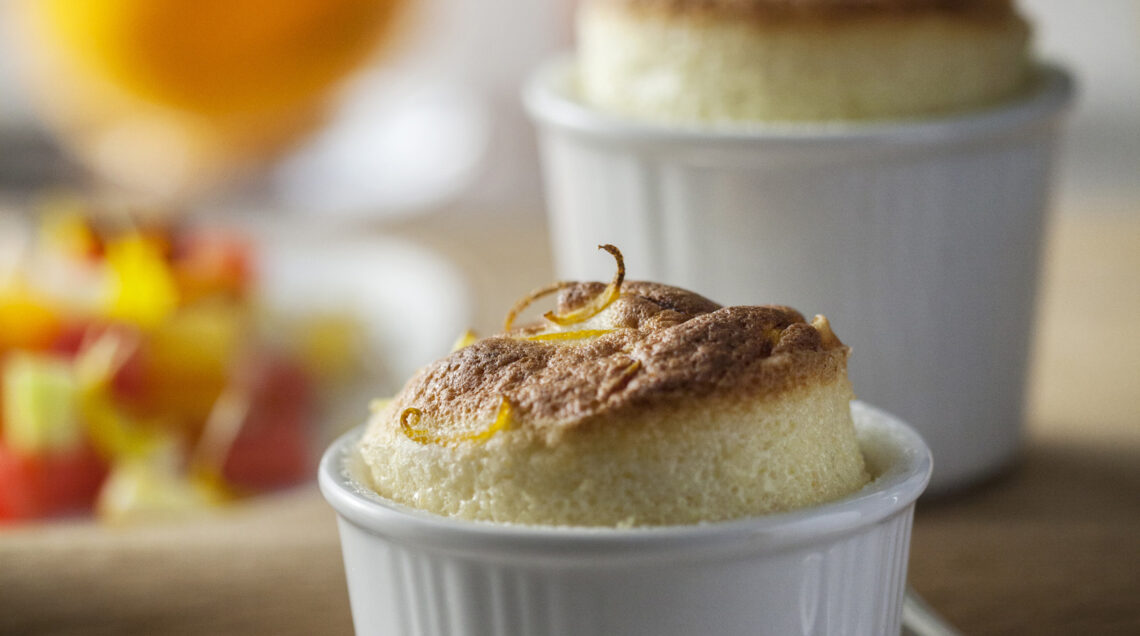 6) Nel frattempo taglia a dadini il pompelmo, l'arancia rimasta e il cedro, condisci la macedonia con lo zucchero semolato, qualche goccia di succo di limone verde, il maraschino e il cointreau (facoltativo). Tieni al fresco fino al momento di servire come accompagnamento ai soufflé caldi.