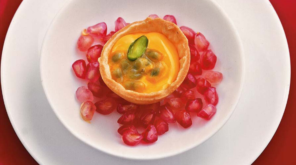 5) Estrai le basi delle tortine dal forno e riempile con la giusta dose di crema, quindi decorale con i pistacchi, i semi del frutto della passione e servi infine le tortine di buonaugurio accompagnate dai chicchi di melograno.