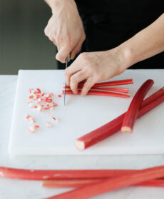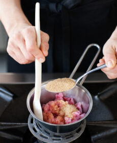 Prepara la composta di rabarbaro: cuoci a fuoco basso i restanti 100 g di rabarbaro, tagliato a quadrettini, in un pentolino con lo zucchero di canna fino a ottenere una composta consistente (20 minuti).