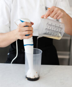Prepara la salsa d'aceto balsamico: mescola l'aceto balsamico e 1 cucchiaio di miele in una ciotola con una frusta; aggiungi 1 pizzichino sale quindi incorpora l'olio di semi di mais, a goccia a goccia, sbattendo con un mixer a immersione fino a ottenere un'emulsione abbastanza densa. Conserva la salsa in frigorifero fino al momento dell'utilizzo.