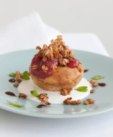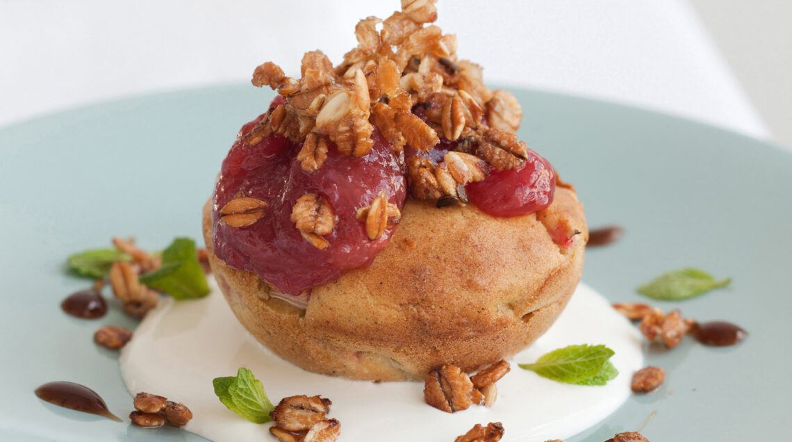 Versa un cucchiaio di panna acida al centro dei piattini e stendila a specchio con il dorso di un cucchiaio bagnato; centra sulla panna una tortina per piatto, guarnisci con la composta di rabarbaro, aiutandoti con una tasca da pasticceria, e il muesli caramellato; rifinisci se ti piace con foglioline di menta. Con la salsa all'aceto balsamico forma piccole gocce di guarnizione, usando un contagocce da cucina o la punta di un cucchiaino, a lato della panna acida. Servi subito.