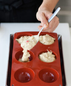 Distribuisci il composto in 8 stampini in silicone di 7-8 cm di diametro e cuoci in forno ventilato a 160° per 20 minuti. Togli le tortine dal forno e lasciale raffreddare. Prepara la panna acida: mescola a freddo lo yogurt magro, panna fresca e 1 cucchiaino (3 g) di succo di limone in una ciotola e fai riposare in frigorifero fino al momento dell'uso.