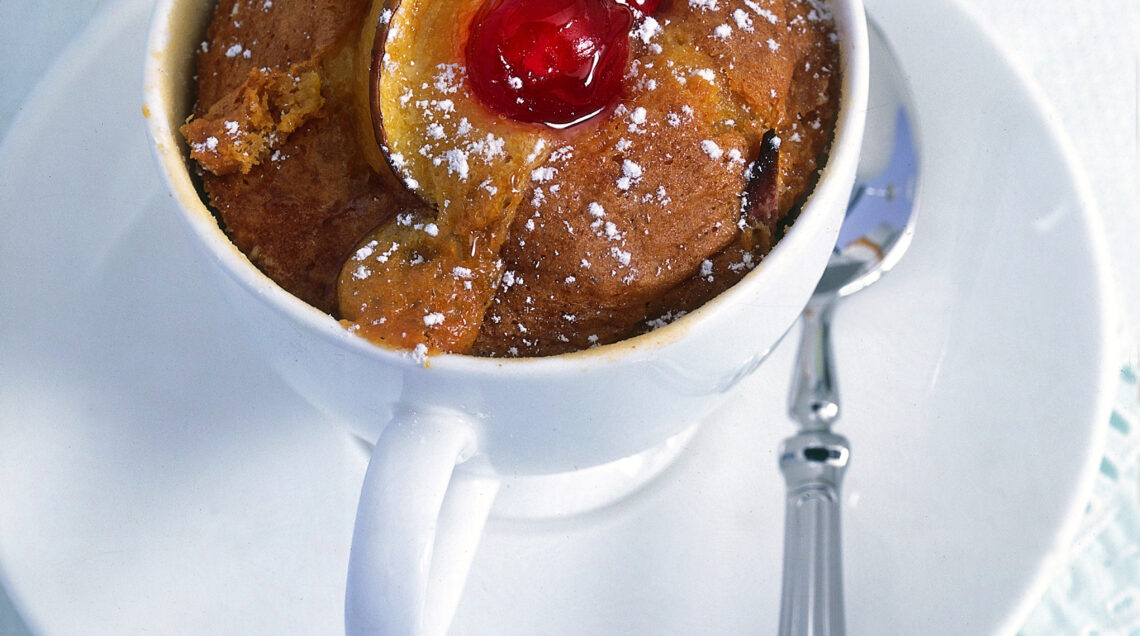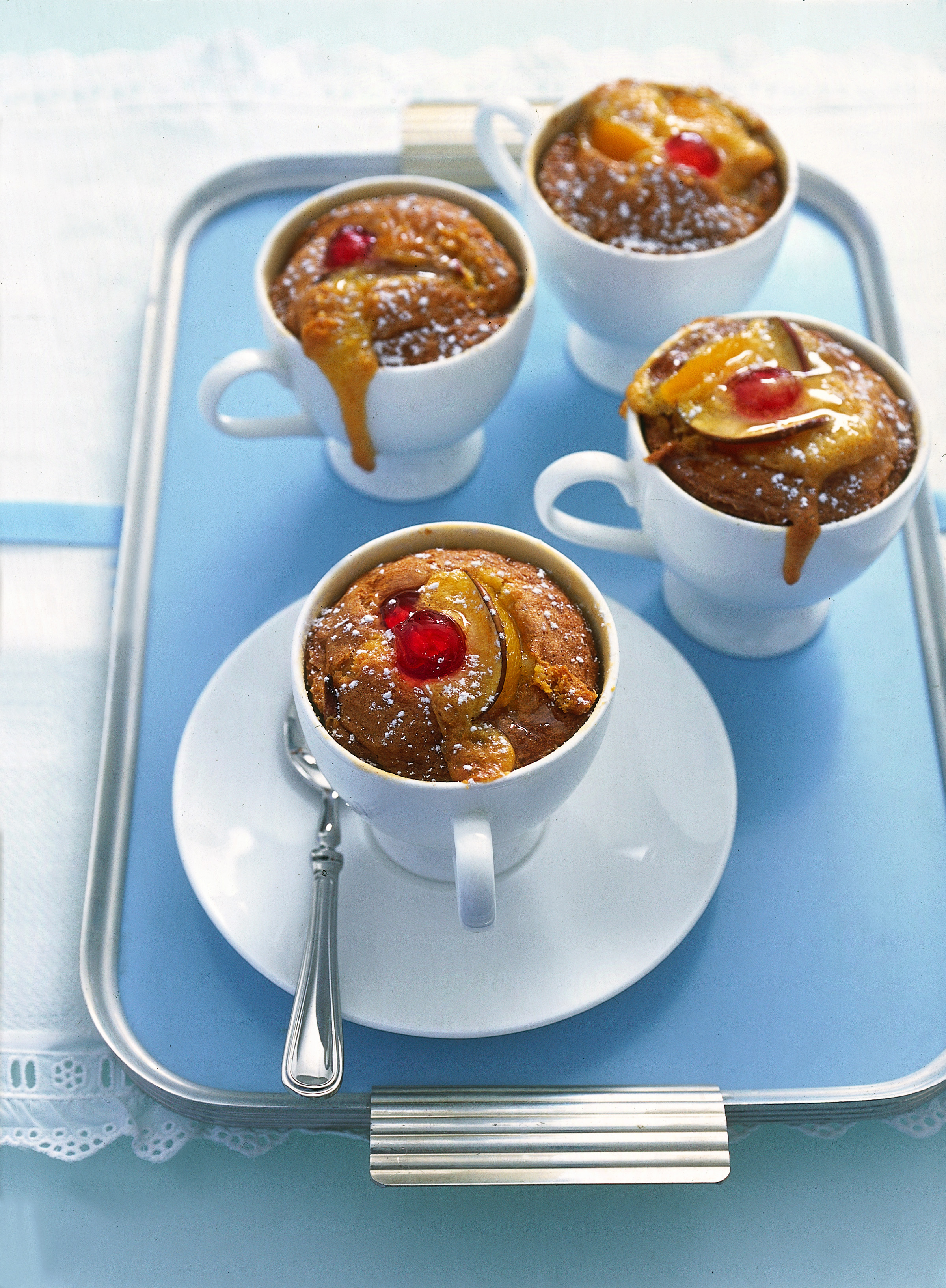 2) Imburra e infarina il fondo e le pareti di 12 tazzine bianche da caffè; taglia la frutta fresca e quella sciroppata a pezzetti dalle forme regolari; distribuisci il tutto nelle tazze. Copri con il composto di uova e decora con le ciliegine candite leggermente infarinate.