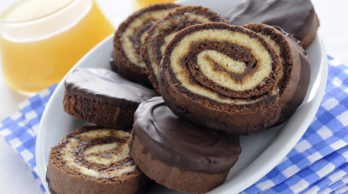 Impasto fatto in casa con uova, farina, zucchero, in bianco o al cacao, sono cotti in forno e farciti con crema spalmabile di cioccolato e nocciole. La glassa al cioccolato completa l'offerta golosa. Si conservano in un luogo fresco avvolta in carta da forno. Se vi piace, potete sostituire la crema spalmabile al cioccolato e nocciole con panna montata, crema pasticcera, marmellata o confettura. La pasta biscuit utilizzata per le girelle è formulata per essere elastica, ma nell'arrotolare il dolce procedete comunque con cautela per evitare che si rompa. Potete anche preparare la pasta biscotto in versione vegana.