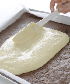 Separate i tuorli di 3 uova dagli albumi e montate a neve gli albumi con un pizzico di sale. Montate i tuorli con 140 g di zucchero a velo. Amalgamate 80 g di farina, il cacao e 1 cucchiaino di lievito setacciati. Incorporate gli albumi, versate in una teglia di 40x30 cm foderata con carta da forno e cuocete in forno a 180° per 8 minuti. Preparate un secondo impasto con le uova, la farina, lo zucchero e il lievito rimasti, ma senza cacao. Stendetelo sul primo impasto con la spatola.