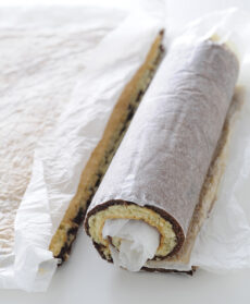 Cuocete ancora 10-12 minuti e sfornate. Fate raffreddare la sfoglia di pasta e tagliatela a metà , in 2 rettangoli di 30X20 cm. Coprite ciascuna metà con un foglio di carta da forno bagnato e strizzato. Arrotolate, partendo dal lato corto, e fate raffreddare. Srotolate le sfoglie di pasta ed eliminate i fogli di carta da forno. Spalmate sulla parte bianca la crema di cioccolato e nocciole, arrotolate, avvolgete in pellicola e mettete in frigo per 2 ore.