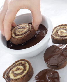 Eliminate la pellicola e tagliate i rotoli a fette di 2-3 cm di spessore. Immergete la base delle fette nel cioccolato fondente fuso e fate asciugare le girelle su carta da forno. Servite.