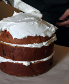 Continua a montare gli albumi, versando lo sciroppo a filo, per 7 minuti a forte velocità. Aggiungi il resto della spremuta di arancia, un cucchiaio alla volta e il liquore, continuando a montare per altri 3 minuti. Taglia il panettone in 3 fette orizzontali di uguale spessore.