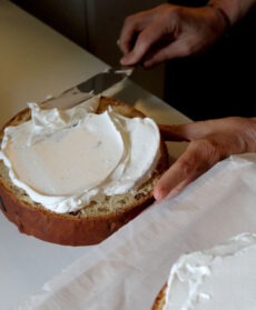 Puoi farcire il panettone su ogni strato con la crema preparata, poi coprilo completamente utilizzando una spatola, senza lisciare la superficie e guarniscilo con i fiocchi di neve preparati.