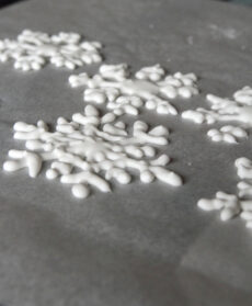 Per preparare i fiocchi di neve lavora l'albume con lo zucchero, aggiungi qualche goccia di succo di limone e mescola vigorosamente la glassa con un cucchiaio di legno per renderla omogenea. Riempi una tasca da pasticciere usa e getta, taglia l'estremità e disegna con la glassa a filo tanti fiocchi di neve sulla carta da forno. Falli asciugare perfettamente per alcune ore prima di staccarli con una piccola spatola e maneggiarli con delicatezza. Puoi prepararli con qualche giorno di anticipo e conservarli in una scatola di metallo; in questo caso, staccali dalla carta solo al momento dell'utilizzo.