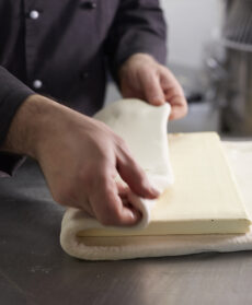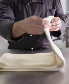 Girate la striscia di 90°, in modo da avere il lato lungo verso di voi. Piegatela in tre, portando verso il centro i lembi laterali e sovrapponendoli. Ristendete in una striscia lunga analoga a quella precedente. Girate di 90° e ripetete altre 2 volte piegatura e stesura. Trasferite la pasta su carta da forno e dividetela in 4 rettangoli di 30x40 cm (se ne avanza si conserva in freezer, avvolta nella carta, per 3 mesi).