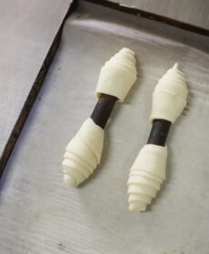 Con un coltello affilato a lama liscia, o una rotella, dividete ogni sfoglia in una decina di striscioline larghe circa 3 cm e lunghe 40 cm. Avvolgete ogni strisciolina a una delle estremità di un legnetto da pasticceria (si trovano nei negozi di attrezzature professionali, oppure potete usare cannoli di metallo oliati).