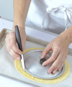Per realizzare il croquembouche in gabbia dorata inizia con lo srotolare il disco di sfoglia su una placca foderata con carta da forno; appoggiaci un coperchio più piccolo di un paio di cm e incidi leggermente la pasta tutt'intorno con la punta di un coltellino: in questo modo dopo la cottura il bordo risulterà più alto dell'interno.