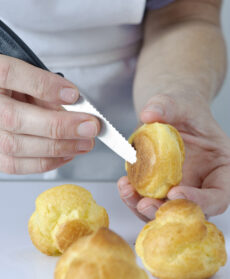 Con la punta del coltellino pratica un piccolo foro sulla base di ogni bignè. Monta la panna fredda aggiungendo lo zucchero a velo.