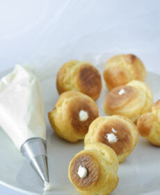 Riempi con la panna una tasca con bocchetta liscia a foro piccolo e farcisci i bignè.